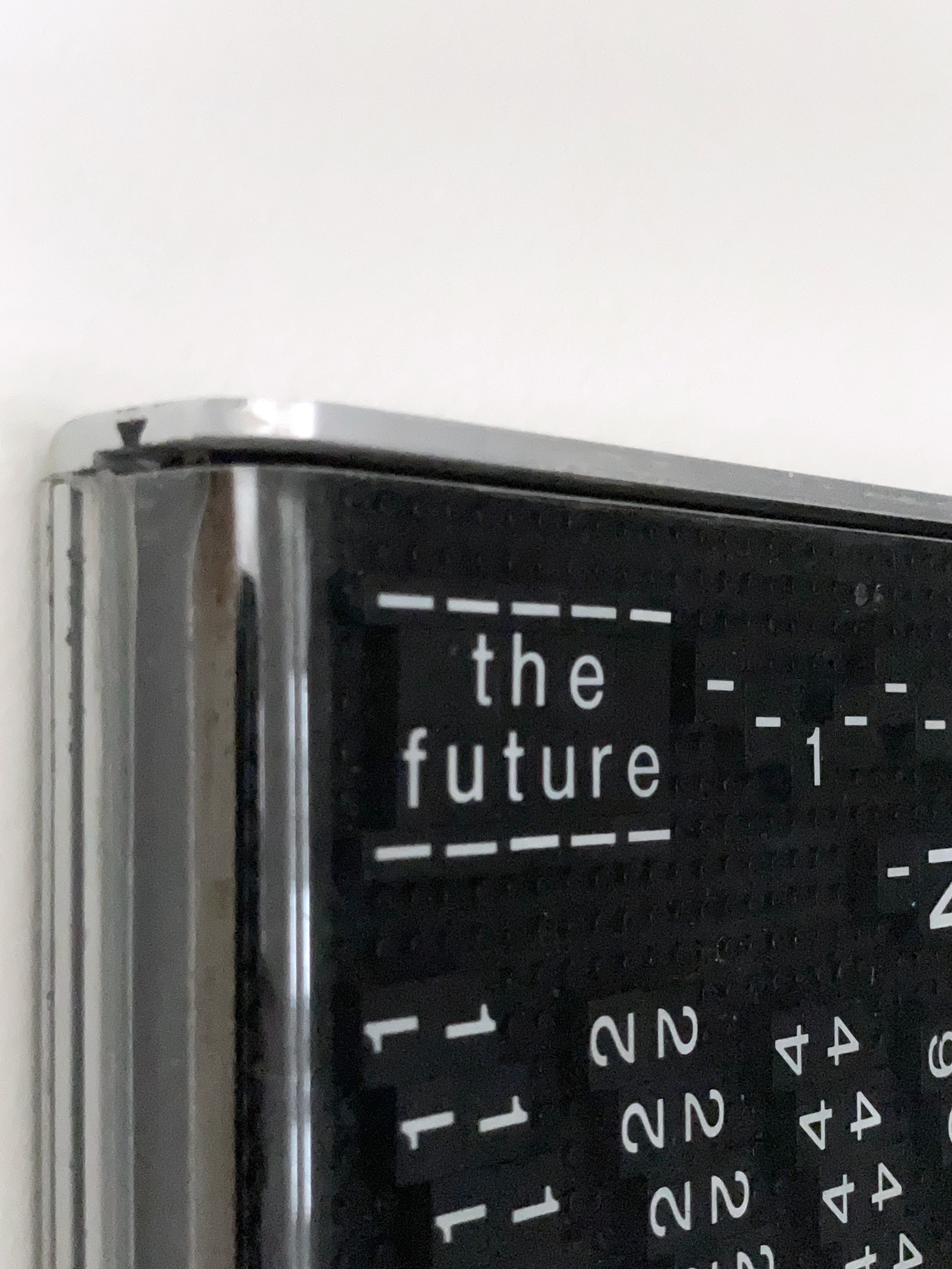 its original interchangeable tiles, once used to display lane times and positions, are preserved and reinterpreted within the panel and presented as the anomaly the future
